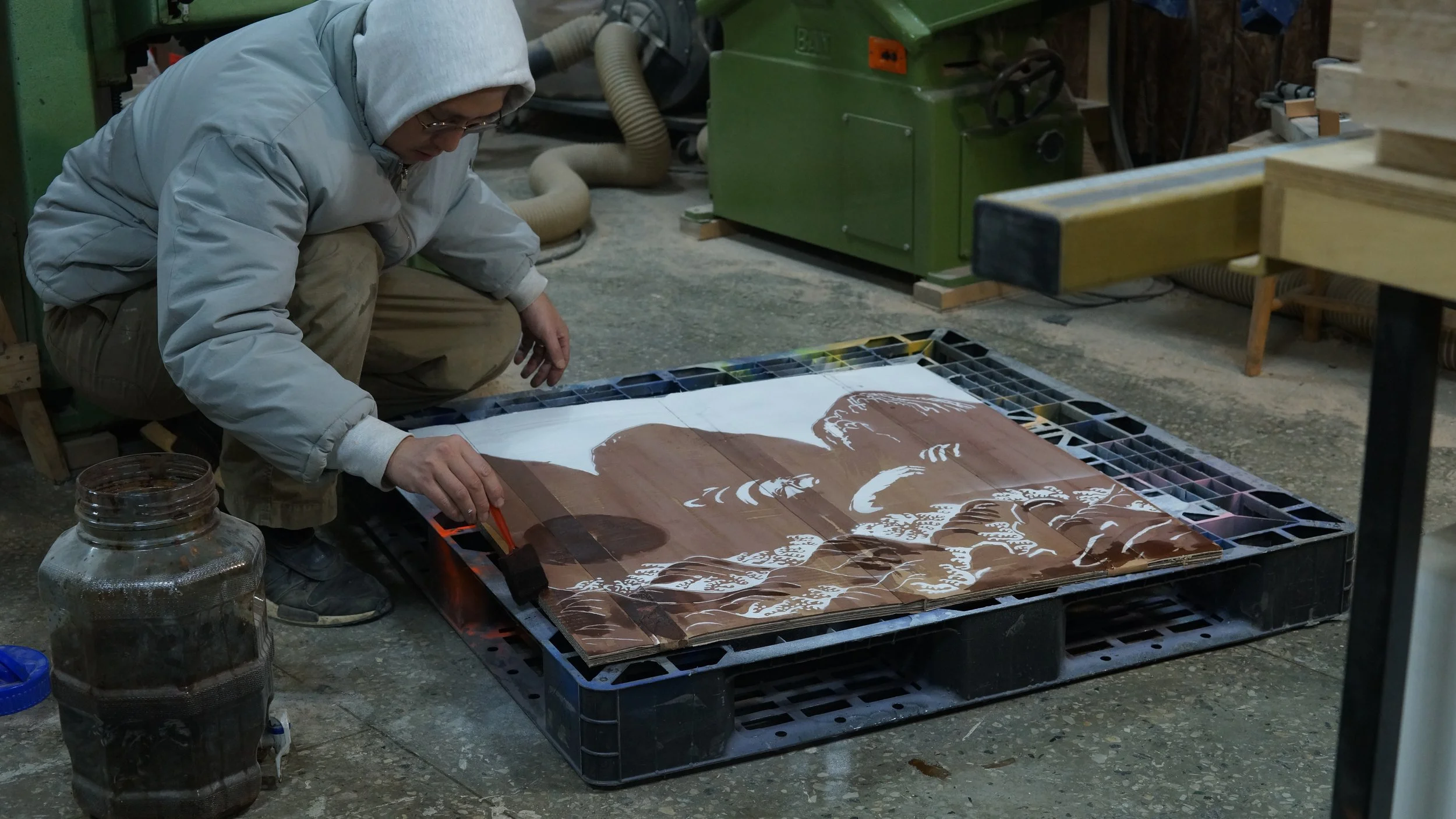 성스러운 것을 훼손한 2폭 양면 병풍. 왕이 누워있다. 주어진 재료들로 만들었다.