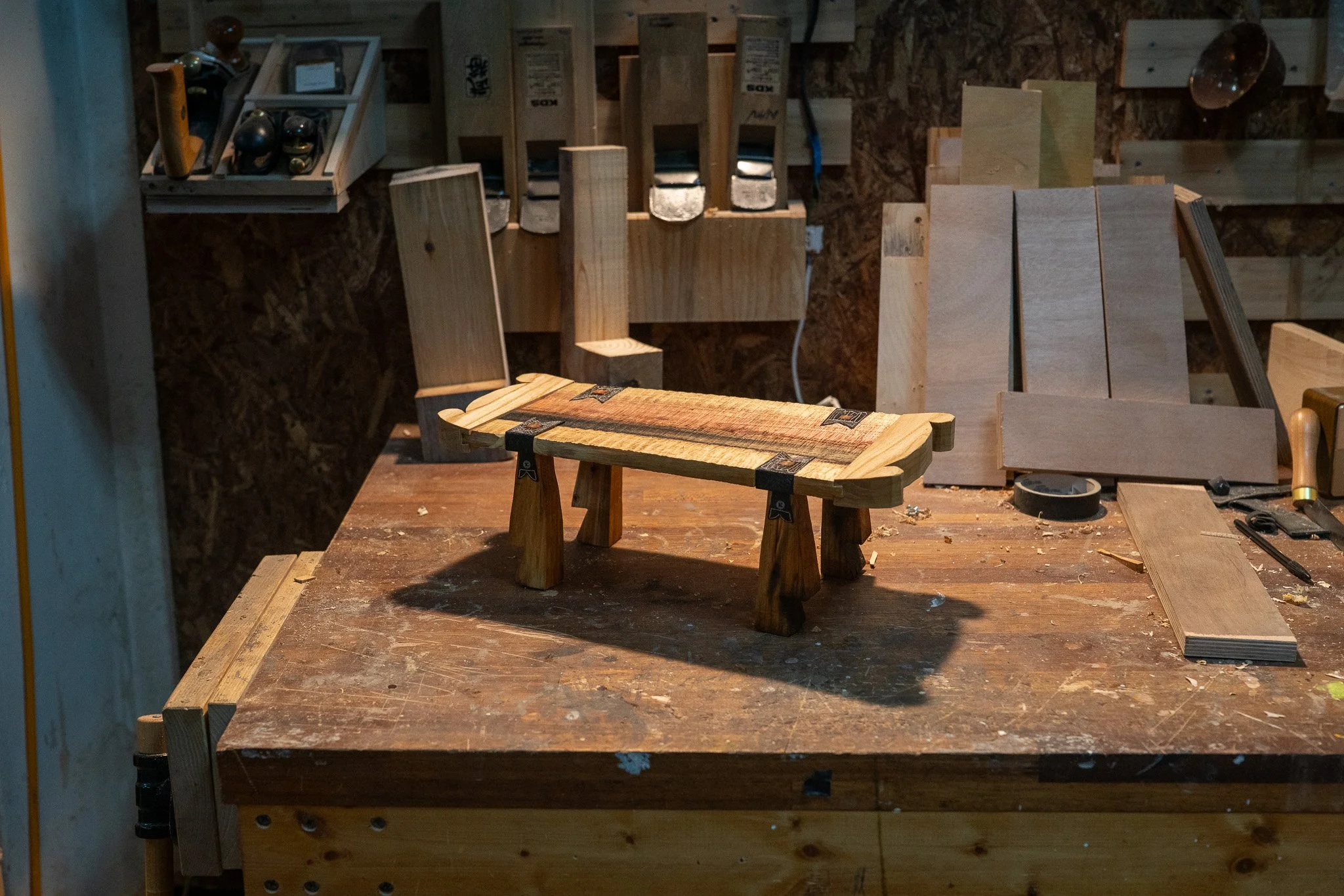 This summer, I cut it down. I built a frame saw to resaw the planks, chiseled the metal fittings on an anvil, and inlaid them with silver. The metal and wood surfaces were finished with ottchil (traditional lacquer), coming together as a four-legged ban—a low table steeped in vernacular form.